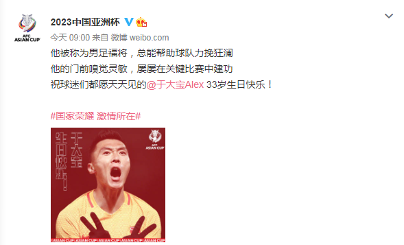 4月18日,北京国安球员、国脚于大宝迎来33岁生日,亚足联在其官方微博向他致以生日祝福,称赞这位国足“福将”总能在关键时刻力挽狂澜。