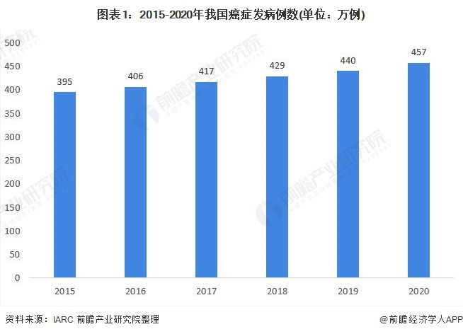 我国癌症发病数逐年增长,据世界卫生组织国际癌症研究中心(IARC)数据,中国癌症发病人数从2015年的395万例增至2020年的457万例。