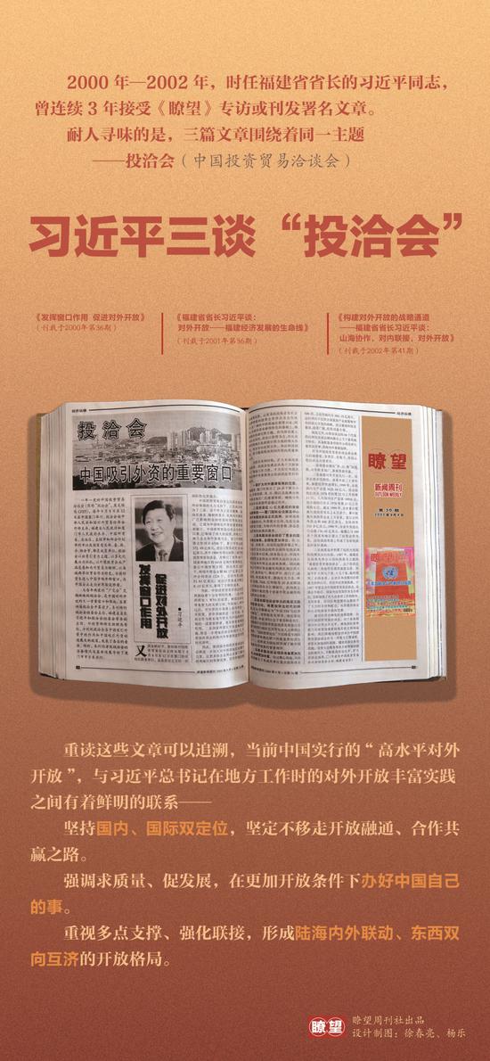 2002年10月14日,《瞭望》刊发专访报道《构建对外开放的战略通道——福建省省长习近平谈:山海协作,对内联接,对外开放》。文中,习近平由第六届投洽会成果,谈及福建进一步扩大对外开放的具体思路——着力构建山海协作、对内联接、对外开放三条战略通道。