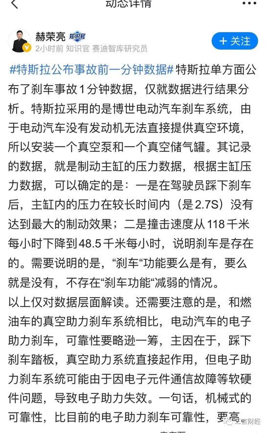 赛迪智库研究员赫荣亮分析特斯拉数据称,仅就数据进行结果分析,驾驶员踩下刹车后,主缸内的压力较长时间内(2.7秒)没有达到最大制动效果;其次,撞击速度从118千米每小时下降至48.5千米每小时,说明刹车是存在的。