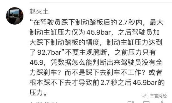 很多网友介绍称,特斯拉的数据只能表明系统采集到刹车信号,但没证明特斯拉如何保证系统对于驾驶员刹车动作能够做到准确采集;其次,如果刹车的确踩不动,刹车泵气压并不能代表驾驶员刹车力度;