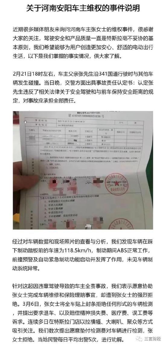 3月11日,张女士发长文详细描述了事发情况,并表示特斯拉方面的说法完全和事实不符。