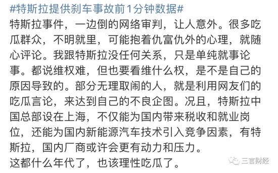 有网友称部分无理取闹的人利用网友吃瓜言论,达到自己的不良企图。特斯拉在中国建厂,不仅能够带来税收和就业,还能为新能源汽车技术引入竞争因素。特斯拉会为国内厂商提供动力和压力,呼吁大家理性吃瓜;