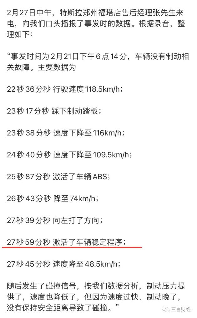 张女士表示,特斯拉郑州福塔店售后经理在电话中通报的行车数据中出现时间有错误问题。也就是前文提到的“27秒59分秒 激活车辆稳定程序”这一条。