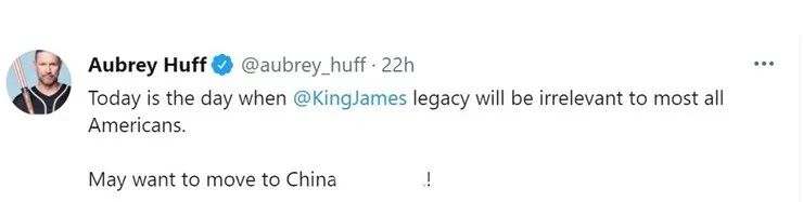 “今日俄罗斯”(RT)称,当地时间21日,美国前棒球明星奥布里·霍夫连发7条推文,疯狂讽刺詹姆斯。其中一条他称,詹姆斯发布上面的推文是因为他“可能想搬去中国”。