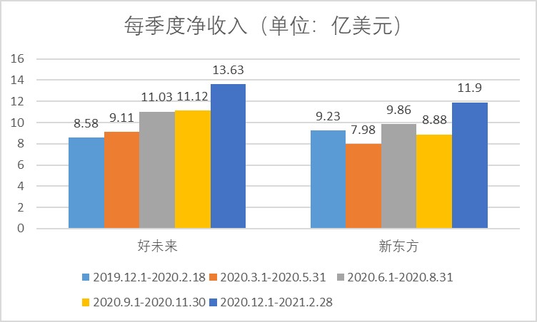 相较于新东方,好未来的扩张表现得更为强劲。在2019年12月到2020年2月期间,好未来的净收入持续上升,新东方的净收入虽整体表现为上升,却一直处于波动状态。