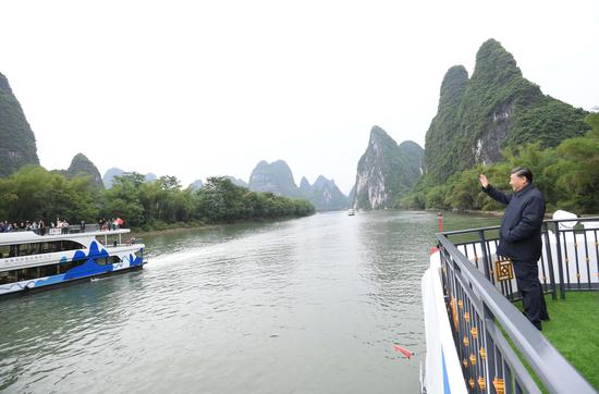 4月25日,正在广西考察调研的习近平总书记,来到桂林市阳朔县漓江杨堤码头,听取漓江流域综合治理、生态保护等情况汇报。