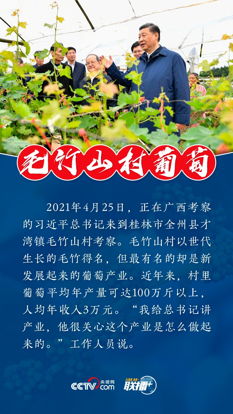 产业兴了,村民富了,山村活了。4月25日上午,正在广西考察的习近平总书记来到桂林市全州县才湾镇毛竹山村,实地察看了村里葡萄产业的发展情况。