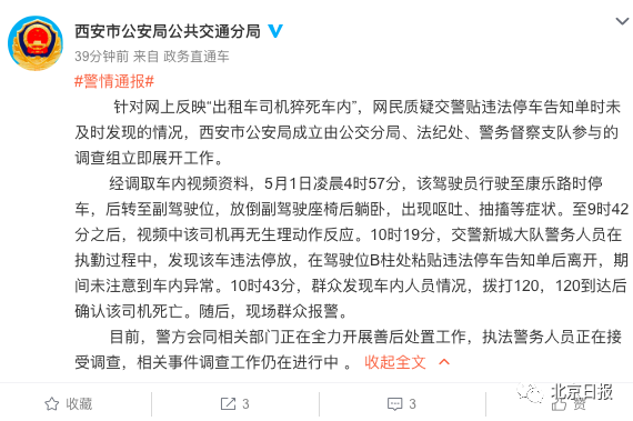 据@西安市公安局公共交通分局 官博5月2日22时24分消息,针对网上反映“出租车司机猝死车内”,网民质疑交警贴违法停车告知单时未及时发现的情况,西安市公安局成立由公交分局、法纪处、警务督察支队参与的调查组立即展开工作。
