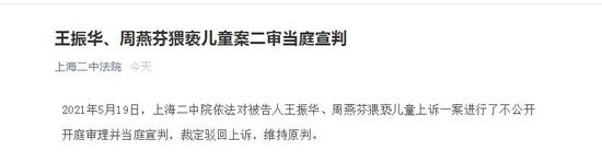 据上海二中院微信号通报,2021年5月19日,上海二中院依法对被告人王振华、周燕芬猥亵儿童上诉一案进行了不公开开庭审理并当庭宣判,裁定驳回上诉,维持原判。