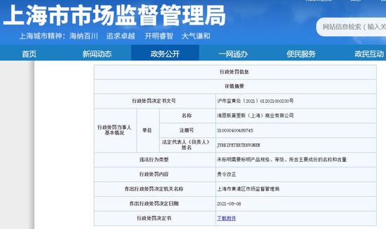 据上海市场监管局官网消息,日前,上海市黄浦区市场监督管理局发布行政处罚信息,因未标明需要标明产品规格、等级、所含主要成份的名称和含量,H&M关联公司海恩斯莫里斯(上海)商业有限公司被责令改正。
