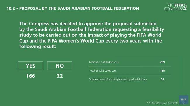 国际足联大会成员对这项提案进行了投票,166票赞成,22票反对,这项提案得到了通过。
