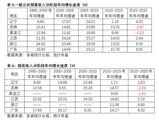 五是近些年东北地区财政收入和税收收入下滑形势严峻。虽然在东北地区在上个世纪到本世纪初的一般公共预算收入、税收收入的增长速度较快(表5、表6),但是最近几年增幅下滑严重,吉林和黑龙江甚至出现了负增长。