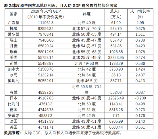 东北地区人口外流与高纬度寒冷气候有一定关系,但不具备强关联。东北地区大概地处北纬40度至50度左右,世界上多数高收入国家均分布在这一纬度区间,比如,卢森堡、瑞士、法国、英国等,一些最高收入国家甚至位于更高纬度(表2)。