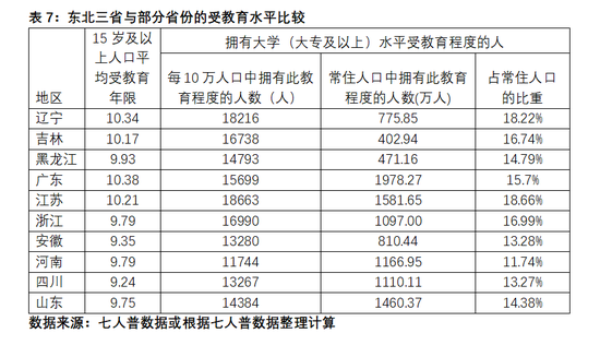 财政收入和税收收入的变化,直接影响到公共服务水平。当公共服务能力下降或者是公共服务水平长期停滞的时候,当然会影响到人才的引进,也会导致城市人才的外流。东北的人均受教育水平在各省份中处于相对领先的位置(表7),但因为沿海发达地区高度重视人才的引进,并给予各种社利待遇,从而吸引外部的人才流入。而对于东北来说,人才的流出也是比较普遍的现象。