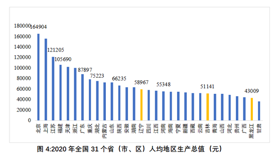 二是东北地区的经济发展水平较低。无论从经济总量,还是从人均GDP来看,除了辽宁的排名在中间位置,吉林、黑龙江两省均是倒数前十(图3、图4)。因此,经济发展水平相对滞后对人口外流一个重要原因。