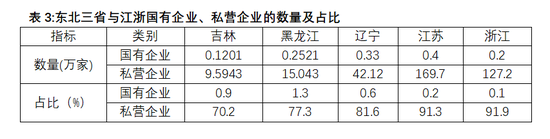 三是容纳就业能力低。2019年工业大省辽宁的城镇登记失业率为4.2%,达到全国最高;黑龙江、吉林的城镇登记失业率分别为3.5%和3.1%,分别位于第6位和第14位(图5)。实际上,中国的民营企业目前吸纳了80%以上的城镇劳动就业。因此,国有企业和私营企业所占比重,可能作为容纳就业能力高低的一个判断依据。而东北三省的私营企业数量远低于江浙,私营企业占比也较后者低了10个-20个百分点(表3)。