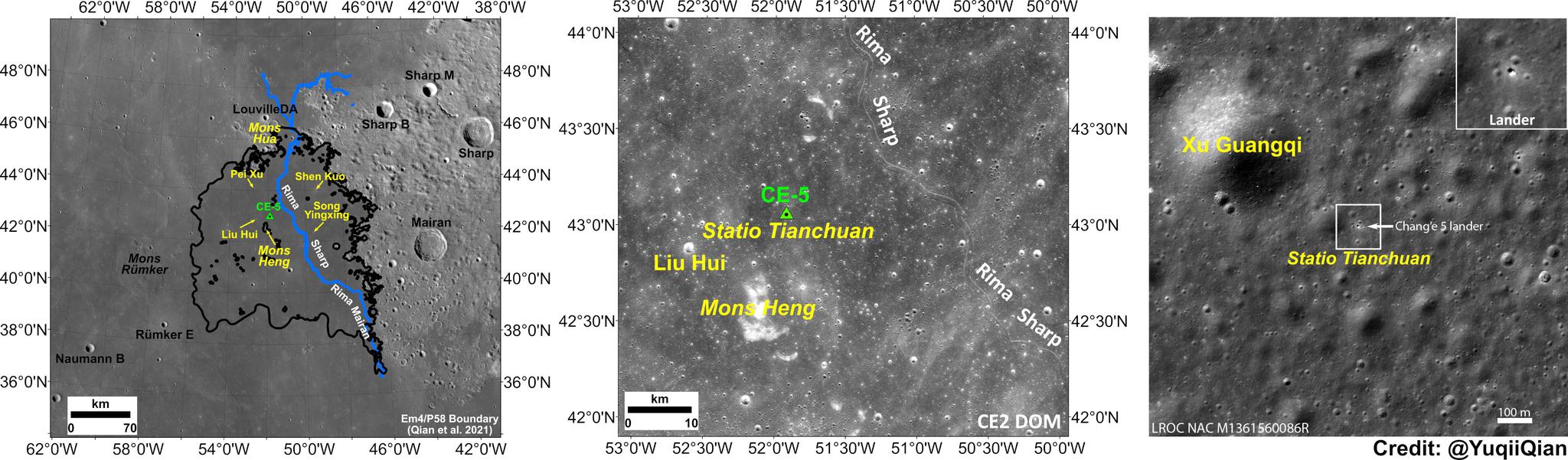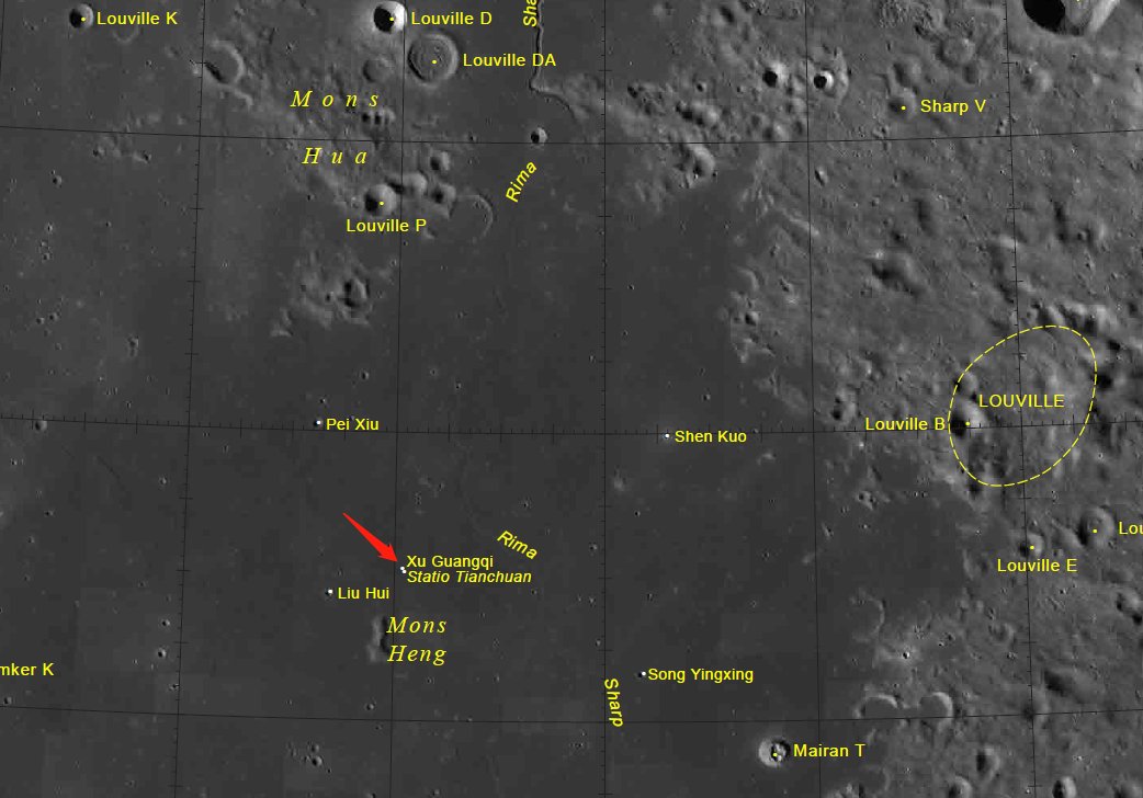 着陆点周围的5个环形坑均以中国历史上的科学家命名。