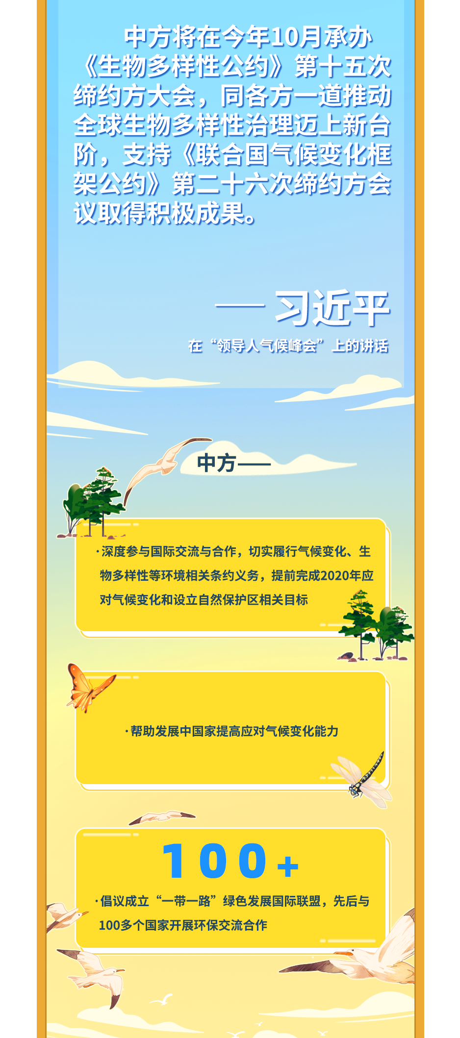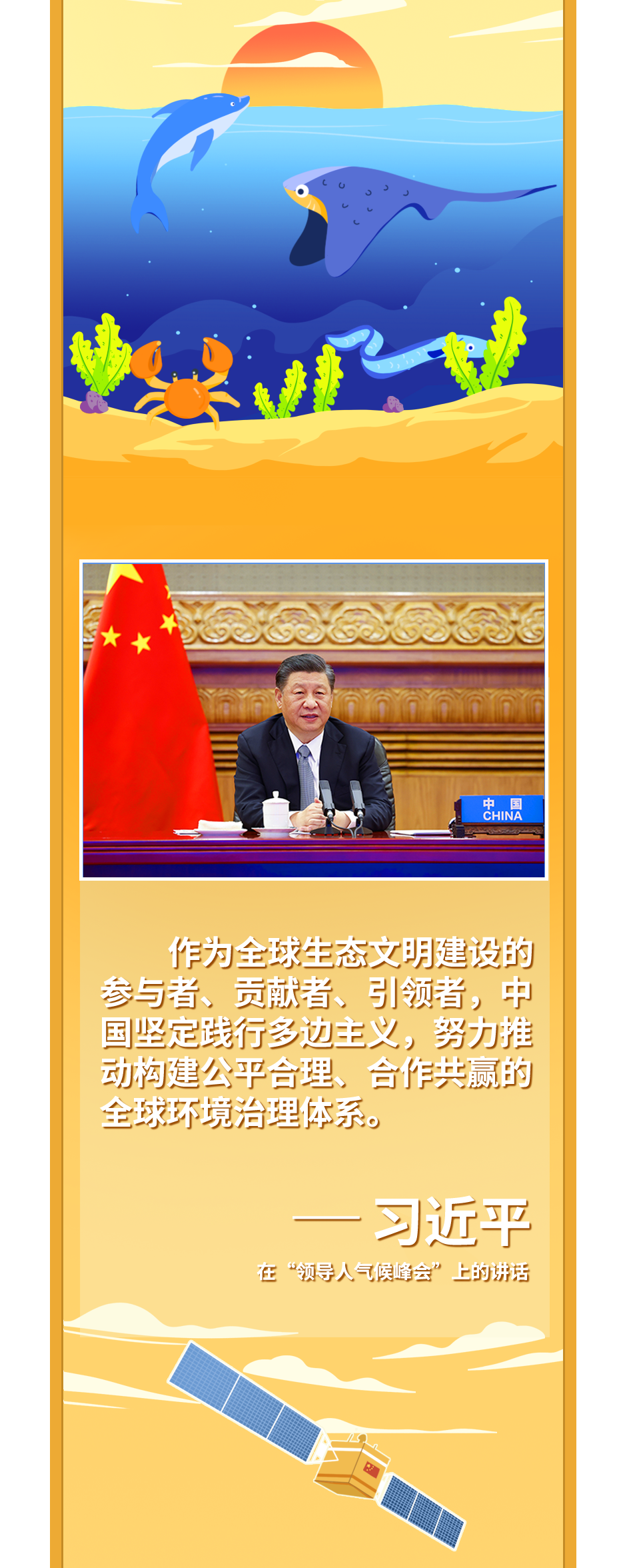 “我们要站在对人类文明负责的高度,尊重自然、顺应自然、保护自然,探索人与自然和谐共生之路,促进经济发展与生态保护协调统一,共建繁荣、清洁、美丽的世界。”