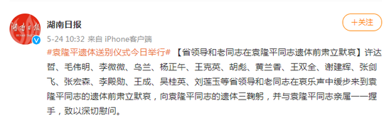 原标题:袁隆平遗体送别仪式今日举行 省领导和老同志在袁隆平同志遗体前肃立默哀