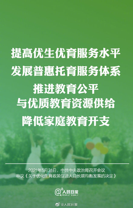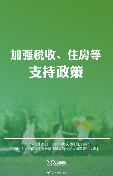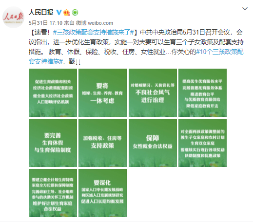 【速看!#三孩政策配套支持措施来了#】中共中央政治局5月31日召开会议,会议指出,进一步优化生育政策,实施一对夫妻可以生育三个子女政策及配套支持措施。 教育、休假、保险、税收、住房、女性就业…你关心的#10个三孩政策配套支持措施#,戳↓↓