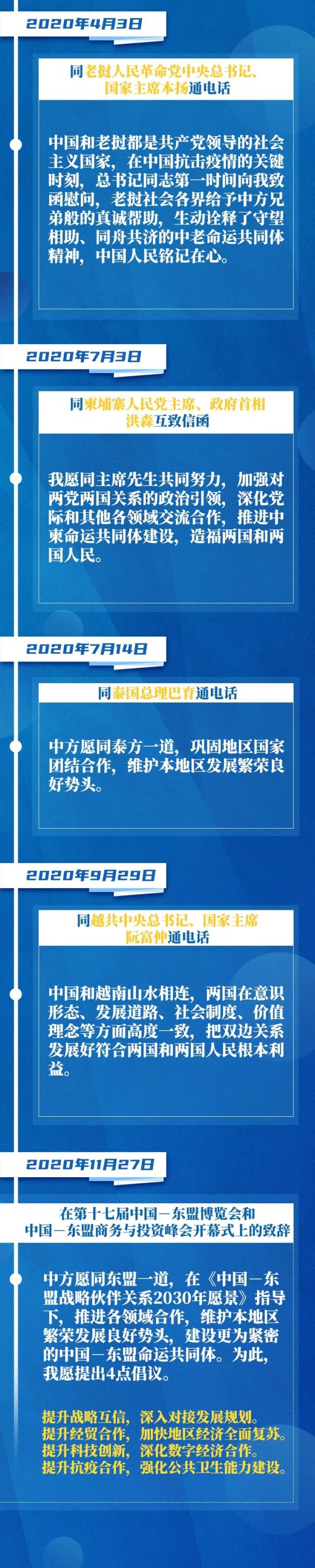2020年11月27日,在第十七届中国-东盟博览会和中国-东盟商务与投资峰会开幕式上,习近平指出,中国-东盟关系成为亚太区域合作中最为成功和最具活力的典范,成为推动构建人类命运共同体的生动例证。