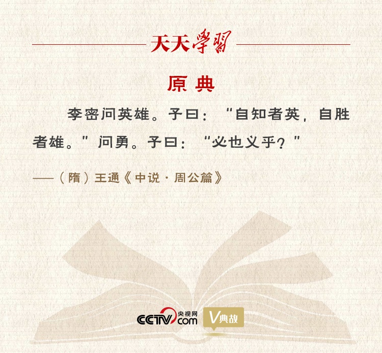 《中说·周公篇》记载了李密与文中子王通的一段对话。李密问何谓英雄?文中子答道:“自知者英,自胜者雄。”意思是能够正确评价自己,并且克服各种私心杂念、战胜自己的人,才是英雄。
