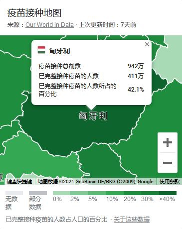 不少外媒都将此归功于疫苗的快速分发。根据“Our World In Data”网站统计,当前匈牙利的疫苗接种数超过942万剂,完整接种疫苗的人数为411万,约占总人口的42.1%,接种率位居世界前列。