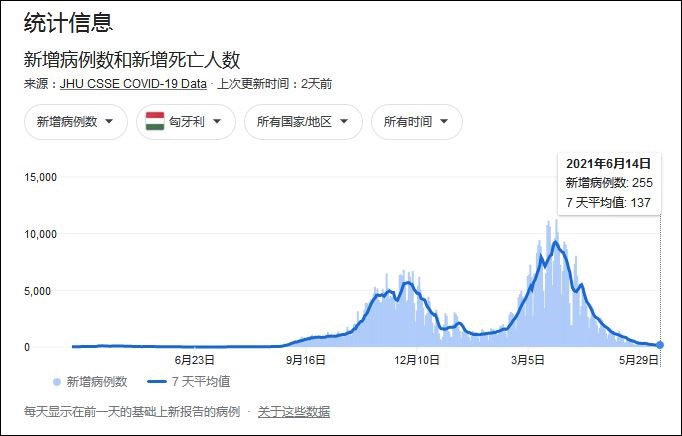 得益于疫苗的广泛接种,匈牙利新冠疫情曲线也在进入4月后急速压平。根据约翰斯·霍普金斯大学数据,匈牙利6月14日的新增病例数为255例,过去7天的平均值为每日137例。