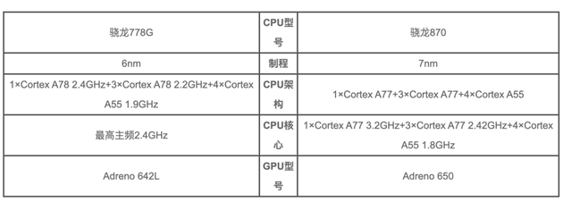 GPU为Adreno642L,是骁龙780G-Adreno642的降频版,778G的制程更新,也用上了A78,但是由于定位所限,主频最高只有2.4GHz,和870差距明显。今年的旗舰骁龙888口碑略有翻车,但硬件参数摆在那,高通778G在功耗、发热上可以拉出来说一说,但性能上无论如何也不会比骁龙888和870更好。