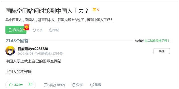 2009年有人提问称“国际空间站何时轮到中国人上去?”,有网友回答:“中国人要上就上自己的国际空间站,上别人的不好玩。”