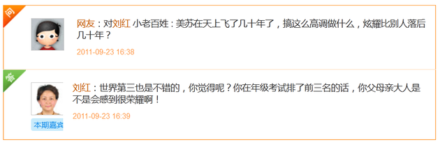 刘红则表示,世界第三也是不错的,你觉得呢?你在年级考试排了前三名的话,你父母亲大人是不是会感到很荣耀啊!
