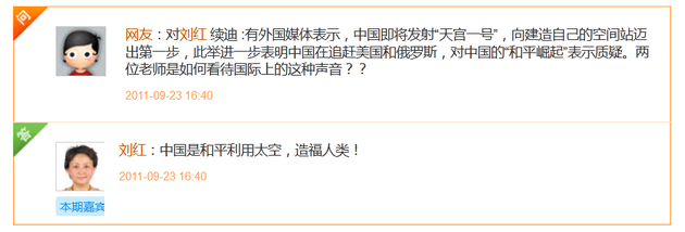 有网友询问,有外国媒体表示,中国即将发射“天宫一号”,向建造自己的空间站迈出第一步,此举进一步表明中国在追赶美国和俄罗斯,对中国的“和平崛起”表示质疑。两位老师是如何看待国际上的这种声音?