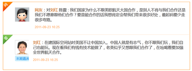 刘红称,在建国际空间站时美国不让中国加入。中国人就是有志气,你不跟我们玩,我们自己也能玩。现在看我们有钱有技术能做了,老美似乎又想跟我们合作了,在吆喝着要加强全世界航天合作。