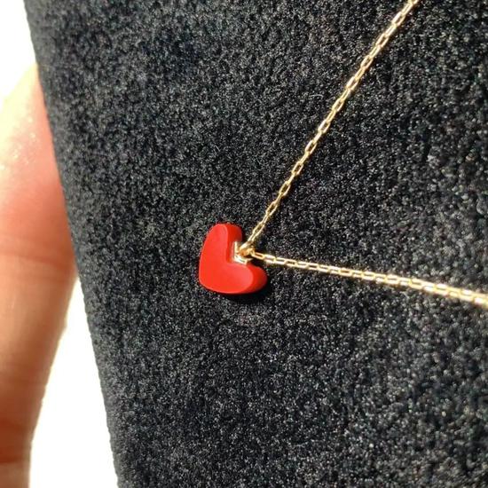 收到项链的时候真的把我美哭了,中间的那颗红珊瑚小心特别吸引人,链子是金色的很细很细,18k真金,戴上特别显肤白。