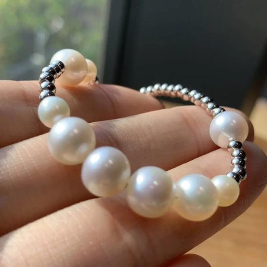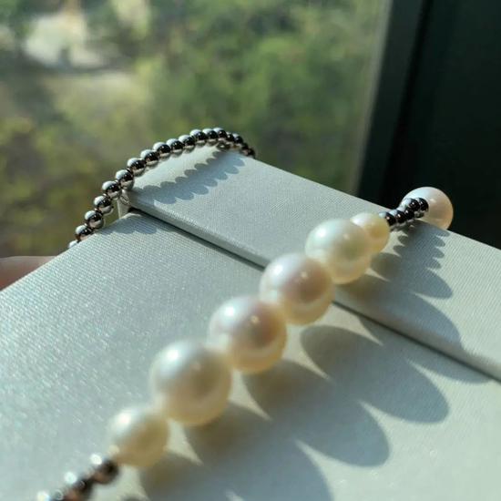 珍珠在自然光下,有着非常明显的彩虹光泽。这一条项链有那么种型号的珍珠,每颗珍珠的颜色几乎都是一样,超级nice。