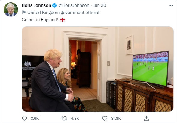 欧洲杯八分之一决赛英格兰队对战德国队赛前,当地时间30日,约翰逊在推特发了一张自己在看比赛的照片。