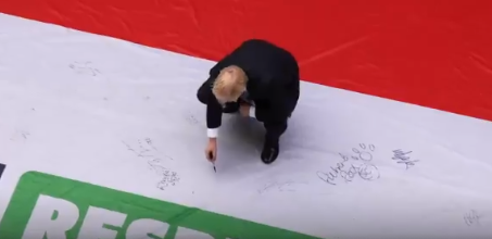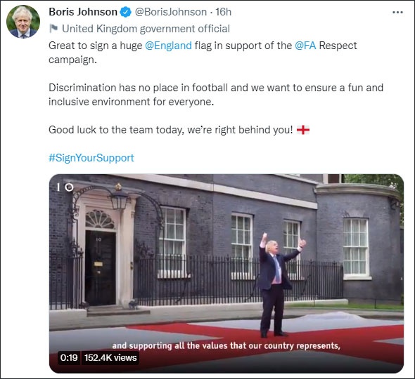 视频中,约翰逊站在代表英格兰的圣乔治十字旗上,发表完支持演说后,他蹲下在旗子上签名。他表示,想要在球场内外消除歧视,为大家建立一个包容又有趣的环境。