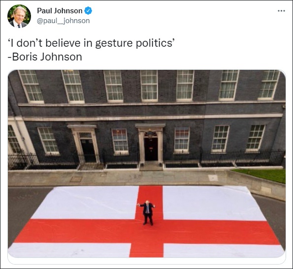 卫报前记者则直接以约翰逊亲口说过的“我不支持姿态政治”来讽刺。在“黑人的命也是命”(BLM)活动蔓延到英国后,一些民众以单膝跪地的姿势参与反对歧视活动,约翰逊曾将其形容为“姿态政治”,表示自己对此持反对态度。