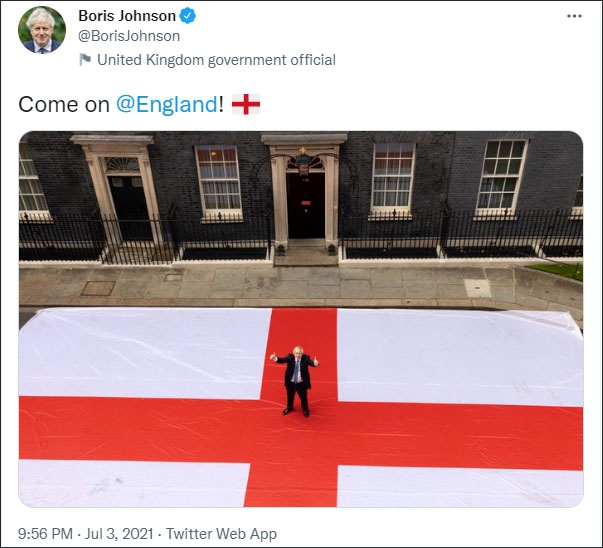 (观察者网讯)脚踩代表英格兰的圣乔治十字旗、双手面向镜头点赞给英格兰队加油,当地时间3日,欧洲杯赛前英国首相约翰逊发布在个人社交媒体的这张照片被英国网民批评,不少人指责此举是对旗帜的侮辱,也有网友认为这是对苏格兰人的不尊重。