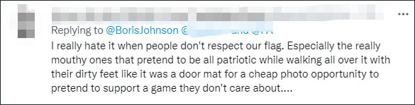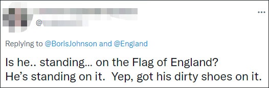 虽然约翰逊自称自己的行为是为了表达“尊重”,但很明显,英国网民并没有感受到。约翰逊的两条推文被网友痛批,有网友认为其脚踩国旗的行为就很不“尊重”。