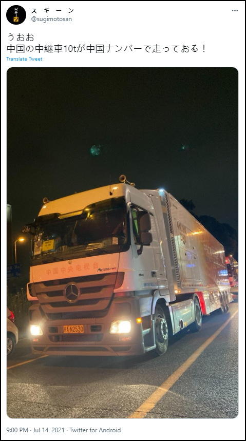 霸气的转播车和中国车牌吸引了日本网友的注意。“哇,中国的10吨转播车挂着中国车牌在路上!”有网友拍下这难得的场面。