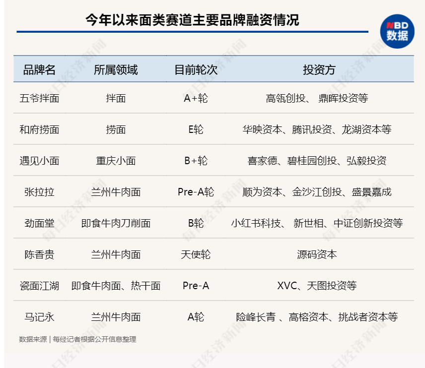 例如,一周前凭借近8亿元E轮融资摘下今年国内面馆行业单轮“吸金王”桂冠的“和府捞面”,截至今年6月该公司旗下门店已超340家;另一坐拥近30亿估值,年内斩获两轮融资的 “遇见小面”在全国也有100余家门店;此外,据《晚点LatePost》报道,近期红杉中国也向朴实无华的兰州牛肉面“马记永”递去了超10亿元估值的投资意向书。