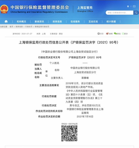 因部分流动资金贷款违规流入房地产市场,中国农业银行股份有限公司上海自贸试验区分行、中国工商银行股份有限公司上海自贸试验区分行均被罚责令改正,并且罚款150万元。中国建设银行股份有限公司上海浦东分行则因以流动资金贷款形式违规发放土地储备贷款、个人消费贷款违规用于购房、个人消费贷款违规流入股市三大违规行为被罚款110万元。