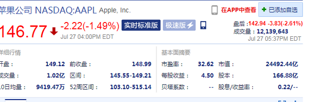 新浪科技讯 北京时间7月28日凌晨消息,据报道,苹果公司今天发布了2021财年第三财季业绩。当日,苹果公司股价在纳斯达克常规交易中下跌2.22美元,报收于146.77美元,跌幅为1.49%。苹果公司第三财季营收和每股收益均超出华尔街分析师此前预期,但其盘后股价仍旧跌超2%。
