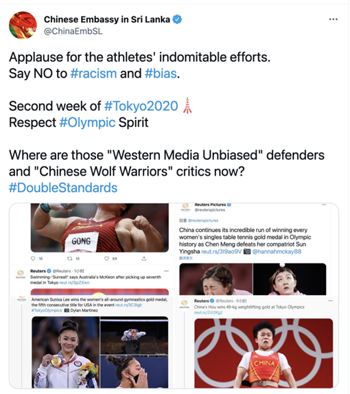 “为运动员们不屈不挠的努力鼓掌,对种族主义和偏见说不。”中国驻斯里兰卡大使馆刚刚在推特发文,将矛头再次对准路透社。在推特中,中国大使馆贴出了4张路透社有关东京奥运会中外运动员夺金的报道截图。
