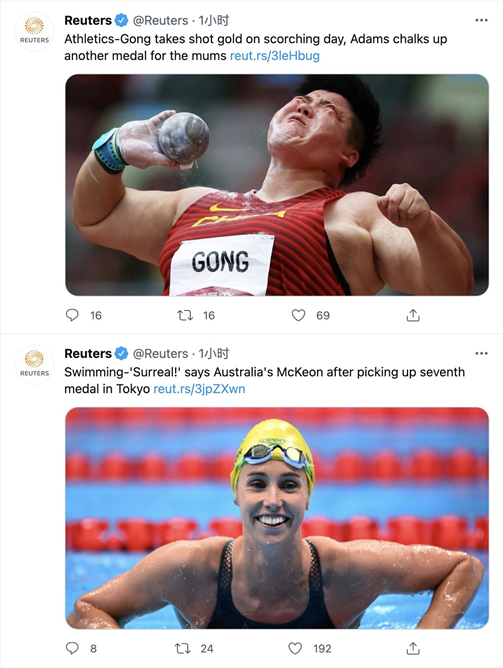 上图为路透社报道中国铅球运动员巩立姣在比赛中夺金,下图为路透社报道澳大利亚游泳运动员麦基恩夺金