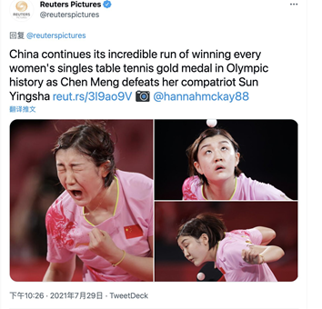 路透社报道中国乒乓球运动员陈梦获得女单冠军