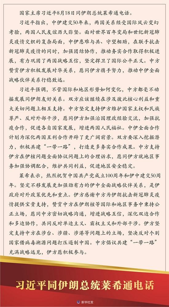 新华社北京8月18日电 国家主席习近平8月18日同伊朗总统莱希通电话。