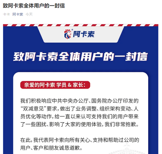 英语培训市场出现问题的不只这一家。近日,佟大为夫妇代言的阿卡索英语疑似失联,家长联系无果,纷纷到代言人微博下寻求帮助。8月18日,阿卡索在其官方公众号作出回应,称绝不存在网传的“跑路”、“倒闭”情况,目前公司仍然在正常运营。